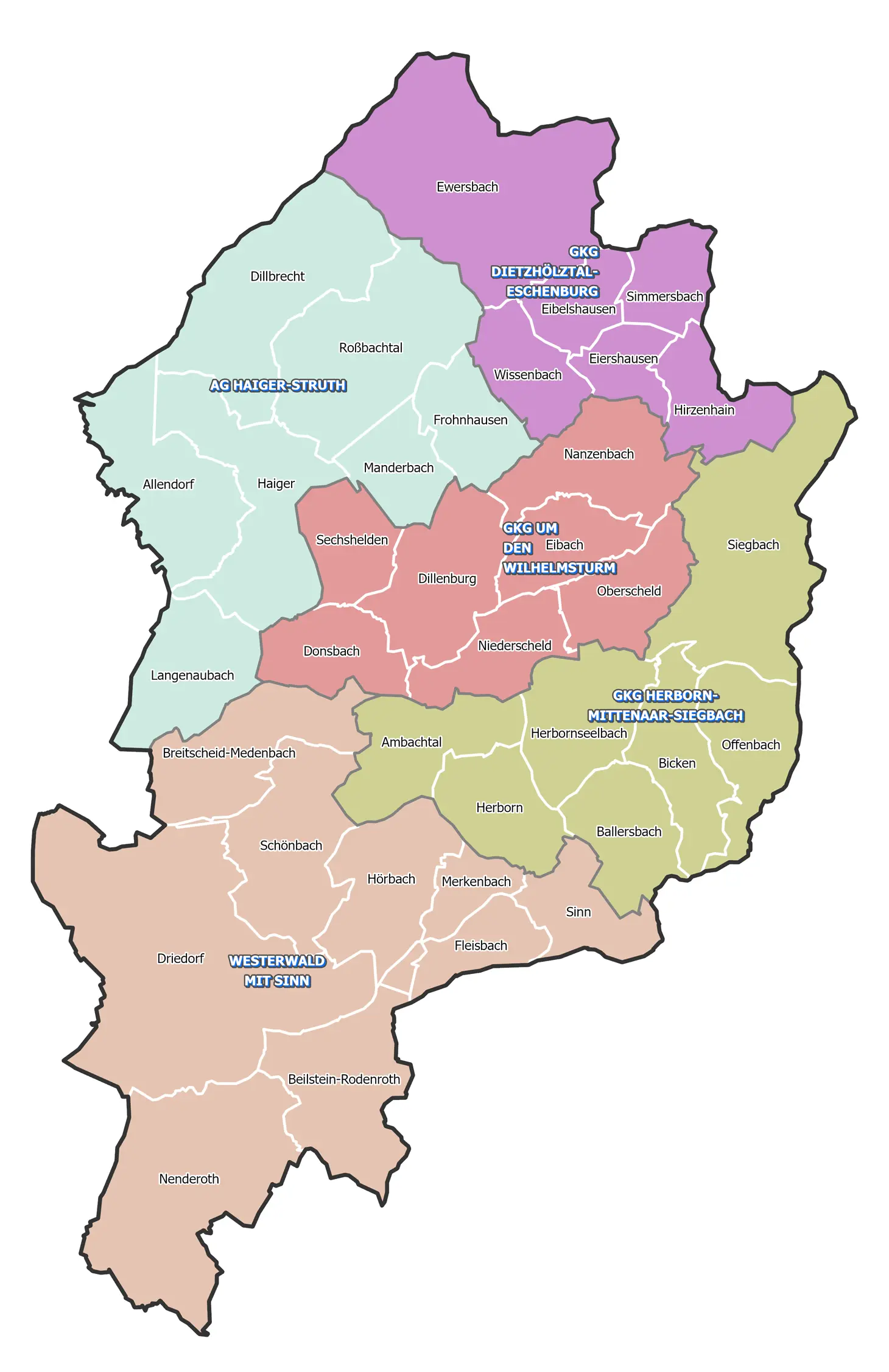 Zur Region zählen die Kirchengemeinden Beilstein-Rodenroth, Breitscheid-Medenbach, Driedorf (mit Heiligenborn, Heisterberg, Hohenroth, Gusternhain, Mademühlen, Münchhausen, Rodenberg, Seilhofen und Waldaubach), Erdbach, Fleisbach, Hörbach, Merkenbach, Nenderoth, Roth, Schönbach und Sinn.